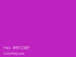 Hex #bf23bf Color is a normal magenta color and the nearest color is Steel Pink #cc33cc. Hex code #bf23bf and RGB value is rgb(191,35,191). In RGB color space, this color is composed of 75% red, 14% green, 75% blue, In CMYK color space, this color is composed of 0% cyan, 82% magenta, 0% yellow , 25% black , In HSL color space, this color has a hue angle of 300° , 69% saturation and 44% lightness.