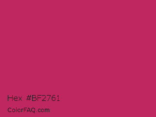 Hex #bf2761 Color is a normal rose color and the nearest color is Rose Red #c21e56. Hex code #bf2761 and RGB value is rgb(191,39,97). In RGB color space, this color is composed of 75% red, 15% green, 38% blue, In CMYK color space, this color is composed of 0% cyan, 80% magenta, 49% yellow , 25% black , In HSL color space, this color has a hue angle of 337° , 66% saturation and 45% lightness.