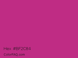 Hex #bf2c84 Color is a normal magenta color and the nearest color is Medium Red Violet #bb3385. Hex code #bf2c84 and RGB value is rgb(191,44,132). In RGB color space, this color is composed of 75% red, 17% green, 52% blue, In CMYK color space, this color is composed of 0% cyan, 77% magenta, 31% yellow , 25% black , In HSL color space, this color has a hue angle of 324° , 63% saturation and 46% lightness.