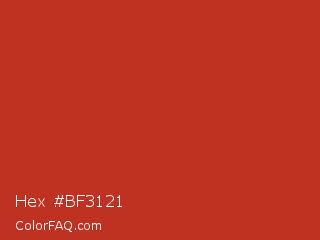 Hex #bf3121 Color is a normal red color and the nearest color is Dark Pastel Red #c23b22. Hex code #bf3121 and RGB value is rgb(191,49,33). In RGB color space, this color is composed of 75% red, 19% green, 13% blue, In CMYK color space, this color is composed of 0% cyan, 74% magenta, 83% yellow , 25% black , In HSL color space, this color has a hue angle of 6° , 71% saturation and 44% lightness.