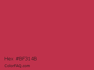 Hex #bf314b Color is a normal red color and the nearest color is Dingy Dungeon #c53151. Hex code #bf314b and RGB value is rgb(191,49,75). In RGB color space, this color is composed of 75% red, 19% green, 29% blue, In CMYK color space, this color is composed of 0% cyan, 74% magenta, 61% yellow , 25% black , In HSL color space, this color has a hue angle of 349° , 59% saturation and 47% lightness.