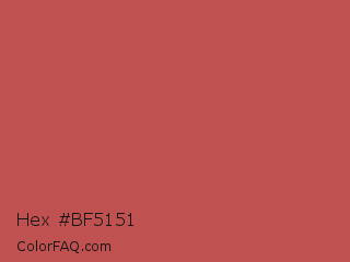 Hex #bf5151 Color is a normal red color and the nearest color is Bittersweet Shimmer #bf4f51. Hex code #bf5151 and RGB value is rgb(191,81,81). In RGB color space, this color is composed of 75% red, 32% green, 32% blue, In CMYK color space, this color is composed of 0% cyan, 58% magenta, 58% yellow , 25% black , In HSL color space, this color has a hue angle of 0° , 46% saturation and 53% lightness.