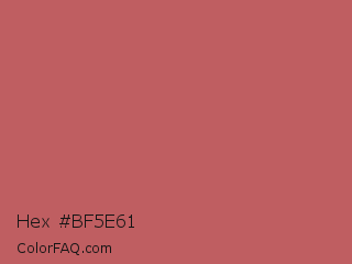 Hex #bf5e61 Color is a normal red color and the nearest color is Chestnut Rose #cd5c5c. Hex code #bf5e61 and RGB value is rgb(191,94,97). In RGB color space, this color is composed of 75% red, 37% green, 38% blue, In CMYK color space, this color is composed of 0% cyan, 51% magenta, 49% yellow , 25% black , In HSL color space, this color has a hue angle of 358° , 43% saturation and 56% lightness.