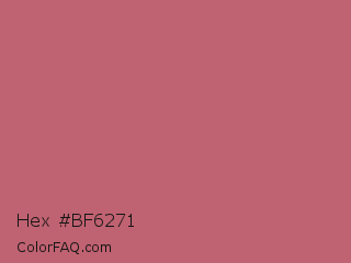 Hex #bf6271 Color is a normal red color and the nearest color is Rose Gold #b76e79. Hex code #bf6271 and RGB value is rgb(191,98,113). In RGB color space, this color is composed of 75% red, 38% green, 44% blue, In CMYK color space, this color is composed of 0% cyan, 49% magenta, 41% yellow , 25% black , In HSL color space, this color has a hue angle of 350° , 42% saturation and 57% lightness.