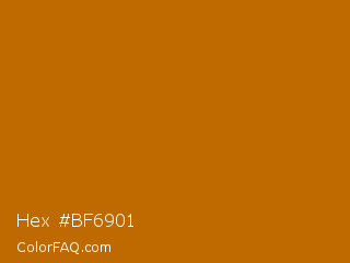 Hex #bf6901 Color is a normal orange color and the nearest color is Indochine #c26b03. Hex code #bf6901 and RGB value is rgb(191,105,1). In RGB color space, this color is composed of 75% red, 41% green, 0% blue, In CMYK color space, this color is composed of 0% cyan, 45% magenta, 99% yellow , 25% black , In HSL color space, this color has a hue angle of 33° , 99% saturation and 38% lightness.
