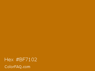 Hex #bf7102 Color is a normal orange color and the nearest color is Indochine #c26b03. Hex code #bf7102 and RGB value is rgb(191,113,2). In RGB color space, this color is composed of 75% red, 44% green, 1% blue, In CMYK color space, this color is composed of 0% cyan, 41% magenta, 99% yellow , 25% black , In HSL color space, this color has a hue angle of 35° , 98% saturation and 38% lightness.