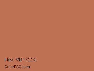 Hex #bf7156 Color is a normal color and the nearest color is Copper Red #cb6d51. Hex code #bf7156 and RGB value is rgb(191,113,86). In RGB color space, this color is composed of 75% red, 44% green, 34% blue, In CMYK color space, this color is composed of 0% cyan, 41% magenta, 55% yellow , 25% black , In HSL color space, this color has a hue angle of 15° , 45% saturation and 54% lightness.