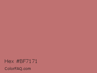 Hex #bf7171 Color is a normal red color and the nearest color is Contessa #c6726b. Hex code #bf7171 and RGB value is rgb(191,113,113). In RGB color space, this color is composed of 75% red, 44% green, 44% blue, In CMYK color space, this color is composed of 0% cyan, 41% magenta, 41% yellow , 25% black , In HSL color space, this color has a hue angle of 0° , 38% saturation and 60% lightness.