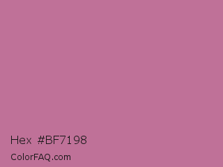 Hex #bf7198 Color is a normal rose color and the nearest color is Pearly Purple #b768a2. Hex code #bf7198 and RGB value is rgb(191,113,152). In RGB color space, this color is composed of 75% red, 44% green, 60% blue, In CMYK color space, this color is composed of 0% cyan, 41% magenta, 20% yellow , 25% black , In HSL color space, this color has a hue angle of 330° , 38% saturation and 60% lightness.