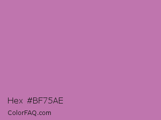Hex #bf75ae Color is a normal magenta color and the nearest color is Sky Magenta #cf71af. Hex code #bf75ae and RGB value is rgb(191,117,174). In RGB color space, this color is composed of 75% red, 46% green, 68% blue, In CMYK color space, this color is composed of 0% cyan, 39% magenta, 9% yellow , 25% black , In HSL color space, this color has a hue angle of 314° , 37% saturation and 60% lightness.