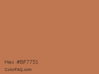 Hex #bf7751 Color is a normal orange color and the nearest color is Copper Red #cb6d51. Hex code #bf7751 and RGB value is rgb(191,119,81). In RGB color space, this color is composed of 75% red, 47% green, 32% blue, In CMYK color space, this color is composed of 0% cyan, 38% magenta, 58% yellow , 25% black , In HSL color space, this color has a hue angle of 21° , 46% saturation and 53% lightness.