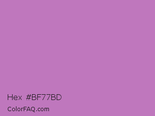 Hex #bf77bd Color is a light magenta color and the nearest color is African Violet #b284be. Hex code #bf77bd and RGB value is rgb(191,119,189). In RGB color space, this color is composed of 75% red, 47% green, 74% blue, In CMYK color space, this color is composed of 0% cyan, 38% magenta, 1% yellow , 25% black , In HSL color space, this color has a hue angle of 302° , 36% saturation and 61% lightness.