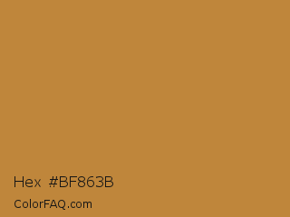 Hex #bf863b Color is a normal orange color and the nearest color is Peru #cd853f. Hex code #bf863b and RGB value is rgb(191,134,59). In RGB color space, this color is composed of 75% red, 53% green, 23% blue, In CMYK color space, this color is composed of 0% cyan, 30% magenta, 69% yellow , 25% black , In HSL color space, this color has a hue angle of 34° , 53% saturation and 49% lightness.