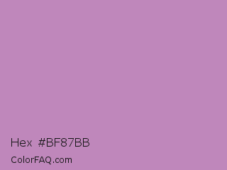 Hex #bf87bb Color is a light magenta color and the nearest color is African Violet #b284be. Hex code #bf87bb and RGB value is rgb(191,135,187). In RGB color space, this color is composed of 75% red, 53% green, 73% blue, In CMYK color space, this color is composed of 0% cyan, 29% magenta, 2% yellow , 25% black , In HSL color space, this color has a hue angle of 304° , 30% saturation and 64% lightness.