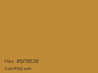 Hex #bf8b38 Color is a normal orange color and the nearest color is Peru #cd853f. Hex code #bf8b38 and RGB value is rgb(191,139,56). In RGB color space, this color is composed of 75% red, 55% green, 22% blue, In CMYK color space, this color is composed of 0% cyan, 27% magenta, 71% yellow , 25% black , In HSL color space, this color has a hue angle of 37° , 55% saturation and 48% lightness.