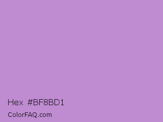 Hex #bf8bd1 Color is a light purple color and the nearest color is Lavender #b57edc. Hex code #bf8bd1 and RGB value is rgb(191,139,209). In RGB color space, this color is composed of 75% red, 55% green, 82% blue, In CMYK color space, this color is composed of 9% cyan, 33% magenta, 0% yellow , 18% black , In HSL color space, this color has a hue angle of 285° , 43% saturation and 68% lightness.