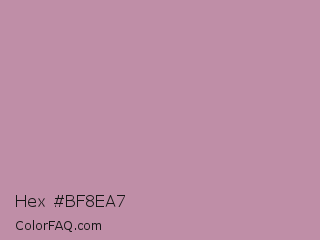 Hex #bf8ea7 Color is a light rose color and the nearest color is Viola #cb8fa9. Hex code #bf8ea7 and RGB value is rgb(191,142,167). In RGB color space, this color is composed of 75% red, 56% green, 65% blue, In CMYK color space, this color is composed of 0% cyan, 26% magenta, 13% yellow , 25% black , In HSL color space, this color has a hue angle of 329° , 28% saturation and 65% lightness.
