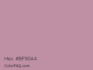 Hex #bf90a4 Color is a light rose color and the nearest color is Viola #cb8fa9. Hex code #bf90a4 and RGB value is rgb(191,144,164). In RGB color space, this color is composed of 75% red, 56% green, 64% blue, In CMYK color space, this color is composed of 0% cyan, 25% magenta, 14% yellow , 25% black , In HSL color space, this color has a hue angle of 334° , 27% saturation and 66% lightness.