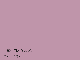 Hex #bf95aa Color is a light rose color and the nearest color is Viola #cb8fa9. Hex code #bf95aa and RGB value is rgb(191,149,170). In RGB color space, this color is composed of 75% red, 58% green, 67% blue, In CMYK color space, this color is composed of 0% cyan, 22% magenta, 11% yellow , 25% black , In HSL color space, this color has a hue angle of 330° , 25% saturation and 67% lightness.