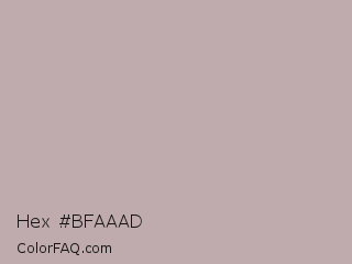 Hex #bfaaad Color is a light red color and the nearest color is Silver Pink #c4aead. Hex code #bfaaad and RGB value is rgb(191,170,173). In RGB color space, this color is composed of 75% red, 67% green, 68% blue, In CMYK color space, this color is composed of 0% cyan, 11% magenta, 9% yellow , 25% black , In HSL color space, this color has a hue angle of 351° , 14% saturation and 71% lightness.