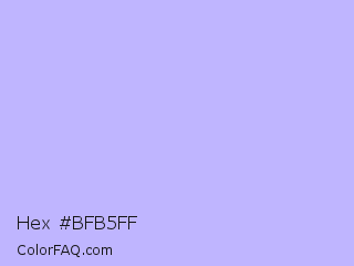 Hex #bfb5ff Color is a very light indigo color and the nearest color is Melrose #c7c1ff. Hex code #bfb5ff and RGB value is rgb(191,181,255). In RGB color space, this color is composed of 75% red, 71% green, 100% blue, In CMYK color space, this color is composed of 25% cyan, 29% magenta, 0% yellow , 0% black , In HSL color space, this color has a hue angle of 248° , 100% saturation and 85% lightness.