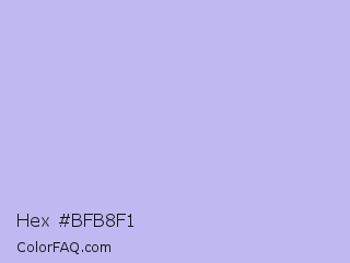 Hex #bfb8f1 Color is a very light indigo color and the nearest color is Melrose #c7c1ff. Hex code #bfb8f1 and RGB value is rgb(191,184,241). In RGB color space, this color is composed of 75% red, 72% green, 95% blue, In CMYK color space, this color is composed of 21% cyan, 24% magenta, 0% yellow , 5% black , In HSL color space, this color has a hue angle of 247° , 67% saturation and 83% lightness.