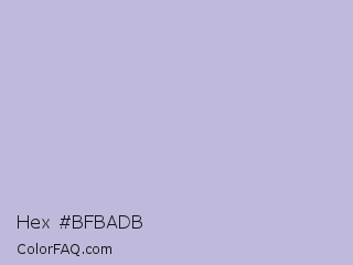 Hex #bfbadb Color is a light indigo color and the nearest color is Lavender Gray #bdbbd7. Hex code #bfbadb and RGB value is rgb(191,186,219). In RGB color space, this color is composed of 75% red, 73% green, 86% blue, In CMYK color space, this color is composed of 13% cyan, 15% magenta, 0% yellow , 14% black , In HSL color space, this color has a hue angle of 249° , 31% saturation and 79% lightness.