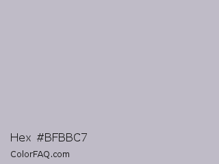 Hex #bfbbc7 Color is a light indigo color and the nearest color is French Gray #bdbdc6. Hex code #bfbbc7 and RGB value is rgb(191,187,199). In RGB color space, this color is composed of 75% red, 73% green, 78% blue, In CMYK color space, this color is composed of 4% cyan, 6% magenta, 0% yellow , 22% black , In HSL color space, this color has a hue angle of 260° , 10% saturation and 76% lightness.