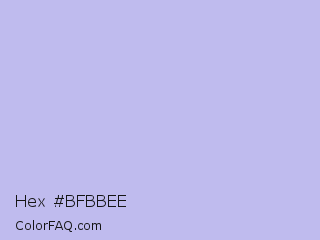 Hex #bfbbee Color is a very light indigo color and the nearest color is Melrose #c7c1ff. Hex code #bfbbee and RGB value is rgb(191,187,238). In RGB color space, this color is composed of 75% red, 73% green, 93% blue, In CMYK color space, this color is composed of 20% cyan, 21% magenta, 0% yellow , 7% black , In HSL color space, this color has a hue angle of 245° , 60% saturation and 83% lightness.