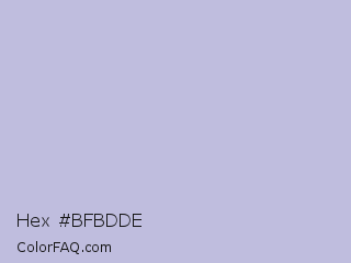Hex #bfbdde Color is a very light indigo color and the nearest color is Blue Haze #bfbed8. Hex code #bfbdde and RGB value is rgb(191,189,222). In RGB color space, this color is composed of 75% red, 74% green, 87% blue, In CMYK color space, this color is composed of 14% cyan, 15% magenta, 0% yellow , 13% black , In HSL color space, this color has a hue angle of 244° , 33% saturation and 81% lightness.