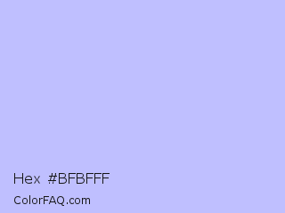 Hex #bfbfff Color is a very light blue color and the nearest color is Melrose #c7c1ff. Hex code #bfbfff and RGB value is rgb(191,191,255). In RGB color space, this color is composed of 75% red, 75% green, 100% blue, In CMYK color space, this color is composed of 25% cyan, 25% magenta, 0% yellow , 0% black , In HSL color space, this color has a hue angle of 240° , 100% saturation and 87% lightness.