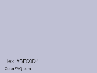 Hex #bfc0d4 Color is a light blue color and the nearest color is Blue Haze #bfbed8. Hex code #bfc0d4 and RGB value is rgb(191,192,212). In RGB color space, this color is composed of 75% red, 75% green, 83% blue, In CMYK color space, this color is composed of 10% cyan, 9% magenta, 0% yellow , 17% black , In HSL color space, this color has a hue angle of 237° , 20% saturation and 79% lightness.