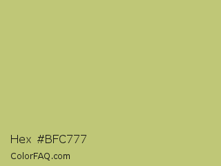 Hex #bfc777 Color is a light yellow color and the nearest color is Wild Willow #b9c46a. Hex code #bfc777 and RGB value is rgb(191,199,119). In RGB color space, this color is composed of 75% red, 78% green, 47% blue, In CMYK color space, this color is composed of 4% cyan, 0% magenta, 40% yellow , 22% black , In HSL color space, this color has a hue angle of 66° , 42% saturation and 62% lightness.