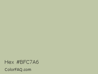 Hex #bfc7a6 Color is a light lime color and the nearest color is Rainee #b9c8ac. Hex code #bfc7a6 and RGB value is rgb(191,199,166). In RGB color space, this color is composed of 75% red, 78% green, 65% blue, In CMYK color space, this color is composed of 4% cyan, 0% magenta, 17% yellow , 22% black , In HSL color space, this color has a hue angle of 75° , 23% saturation and 72% lightness.