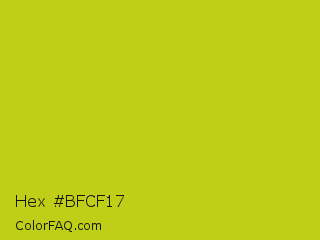 Hex #bfcf17 Color is a normal yellow color and the nearest color is Key Lime Pie #bfc921. Hex code #bfcf17 and RGB value is rgb(191,207,23). In RGB color space, this color is composed of 75% red, 81% green, 9% blue, In CMYK color space, this color is composed of 8% cyan, 0% magenta, 89% yellow , 19% black , In HSL color space, this color has a hue angle of 65° , 80% saturation and 45% lightness.