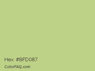 Hex #bfd087 Color is a light lime color and the nearest color is Pine Glade #c7cd90. Hex code #bfd087 and RGB value is rgb(191,208,135). In RGB color space, this color is composed of 75% red, 82% green, 53% blue, In CMYK color space, this color is composed of 8% cyan, 0% magenta, 35% yellow , 18% black , In HSL color space, this color has a hue angle of 74° , 44% saturation and 67% lightness.