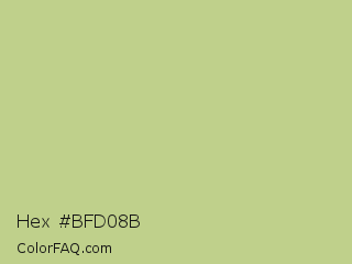 Hex #bfd08b Color is a light lime color and the nearest color is Pine Glade #c7cd90. Hex code #bfd08b and RGB value is rgb(191,208,139). In RGB color space, this color is composed of 75% red, 82% green, 55% blue, In CMYK color space, this color is composed of 8% cyan, 0% magenta, 33% yellow , 18% black , In HSL color space, this color has a hue angle of 75° , 42% saturation and 68% lightness.