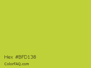 Hex #bfd138 Color is a normal yellow color and the nearest color is Key Lime Pie #bfc921. Hex code #bfd138 and RGB value is rgb(191,209,56). In RGB color space, this color is composed of 75% red, 82% green, 22% blue, In CMYK color space, this color is composed of 9% cyan, 0% magenta, 73% yellow , 18% black , In HSL color space, this color has a hue angle of 67° , 62% saturation and 52% lightness.