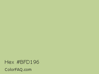 Hex #bfd196 Color is a light lime color and the nearest color is Pine Glade #c7cd90. Hex code #bfd196 and RGB value is rgb(191,209,150). In RGB color space, this color is composed of 75% red, 82% green, 59% blue, In CMYK color space, this color is composed of 9% cyan, 0% magenta, 28% yellow , 18% black , In HSL color space, this color has a hue angle of 78° , 39% saturation and 70% lightness.