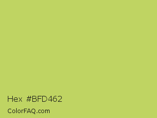 Hex #bfd462 Color is a light lime color and the nearest color is June Bud #bdda57. Hex code #bfd462 and RGB value is rgb(191,212,98). In RGB color space, this color is composed of 75% red, 83% green, 38% blue, In CMYK color space, this color is composed of 10% cyan, 0% magenta, 54% yellow , 17% black , In HSL color space, this color has a hue angle of 71° , 57% saturation and 61% lightness.