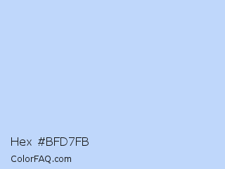 Hex #bfd7fb Color is a very light blue color and the nearest color is Tropical Blue #c3ddf9. Hex code #bfd7fb and RGB value is rgb(191,215,251). In RGB color space, this color is composed of 75% red, 84% green, 98% blue, In CMYK color space, this color is composed of 24% cyan, 14% magenta, 0% yellow , 2% black , In HSL color space, this color has a hue angle of 216° , 88% saturation and 87% lightness.