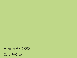 Hex #bfd888 Color is a light lime color and the nearest color is Medium Spring Bud #c9dc87. Hex code #bfd888 and RGB value is rgb(191,216,136). In RGB color space, this color is composed of 75% red, 85% green, 53% blue, In CMYK color space, this color is composed of 12% cyan, 0% magenta, 37% yellow , 15% black , In HSL color space, this color has a hue angle of 79° , 51% saturation and 69% lightness.