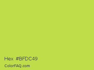 Hex #bfdc49 Color is a normal lime color and the nearest color is June Bud #bdda57. Hex code #bfdc49 and RGB value is rgb(191,220,73). In RGB color space, this color is composed of 75% red, 86% green, 29% blue, In CMYK color space, this color is composed of 13% cyan, 0% magenta, 67% yellow , 14% black , In HSL color space, this color has a hue angle of 72° , 68% saturation and 57% lightness.
