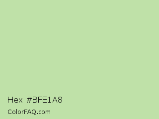 Hex #bfe1a8 Color is a light green color and the nearest color is Sprout #c1d7b0. Hex code #bfe1a8 and RGB value is rgb(191,225,168). In RGB color space, this color is composed of 75% red, 88% green, 66% blue, In CMYK color space, this color is composed of 15% cyan, 0% magenta, 25% yellow , 12% black , In HSL color space, this color has a hue angle of 96° , 49% saturation and 77% lightness.