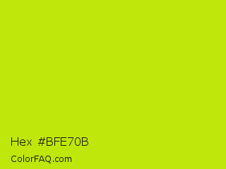 Hex #bfe70b Color is a normal lime color and the nearest color is Las Palmas #c6e610. Hex code #bfe70b and RGB value is rgb(191,231,11). In RGB color space, this color is composed of 75% red, 91% green, 4% blue, In CMYK color space, this color is composed of 17% cyan, 0% magenta, 95% yellow , 9% black , In HSL color space, this color has a hue angle of 71° , 91% saturation and 47% lightness.