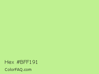 Hex #bff191 Color is a light green color and the nearest color is Sulu #c1f07c. Hex code #bff191 and RGB value is rgb(191,241,145). In RGB color space, this color is composed of 75% red, 95% green, 57% blue, In CMYK color space, this color is composed of 21% cyan, 0% magenta, 40% yellow , 5% black , In HSL color space, this color has a hue angle of 91° , 77% saturation and 76% lightness.
