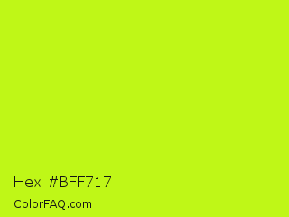 Hex #bff717 Color is a normal lime color and the nearest color is Arctic Lime #d0ff14. Hex code #bff717 and RGB value is rgb(191,247,23). In RGB color space, this color is composed of 75% red, 97% green, 9% blue, In CMYK color space, this color is composed of 23% cyan, 0% magenta, 91% yellow , 3% black , In HSL color space, this color has a hue angle of 75° , 93% saturation and 53% lightness.
