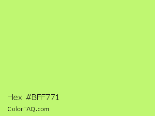 Hex #bff771 Color is a light green color and the nearest color is Sulu #c1f07c. Hex code #bff771 and RGB value is rgb(191,247,113). In RGB color space, this color is composed of 75% red, 97% green, 44% blue, In CMYK color space, this color is composed of 23% cyan, 0% magenta, 54% yellow , 3% black , In HSL color space, this color has a hue angle of 85° , 89% saturation and 71% lightness.
