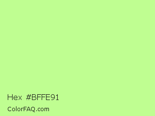 Hex #bffe91 Color is a light green color and the nearest color is Reef #c9ffa2. Hex code #bffe91 and RGB value is rgb(191,254,145). In RGB color space, this color is composed of 75% red, 100% green, 57% blue, In CMYK color space, this color is composed of 25% cyan, 0% magenta, 43% yellow , 0% black , In HSL color space, this color has a hue angle of 95° , 98% saturation and 78% lightness.