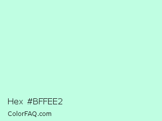 Hex #bffee2 Color is a very light green color and the nearest color is Aero Blue #c9ffe5. Hex code #bffee2 and RGB value is rgb(191,254,226). In RGB color space, this color is composed of 75% red, 100% green, 89% blue, In CMYK color space, this color is composed of 25% cyan, 0% magenta, 11% yellow , 0% black , In HSL color space, this color has a hue angle of 153° , 97% saturation and 87% lightness.
